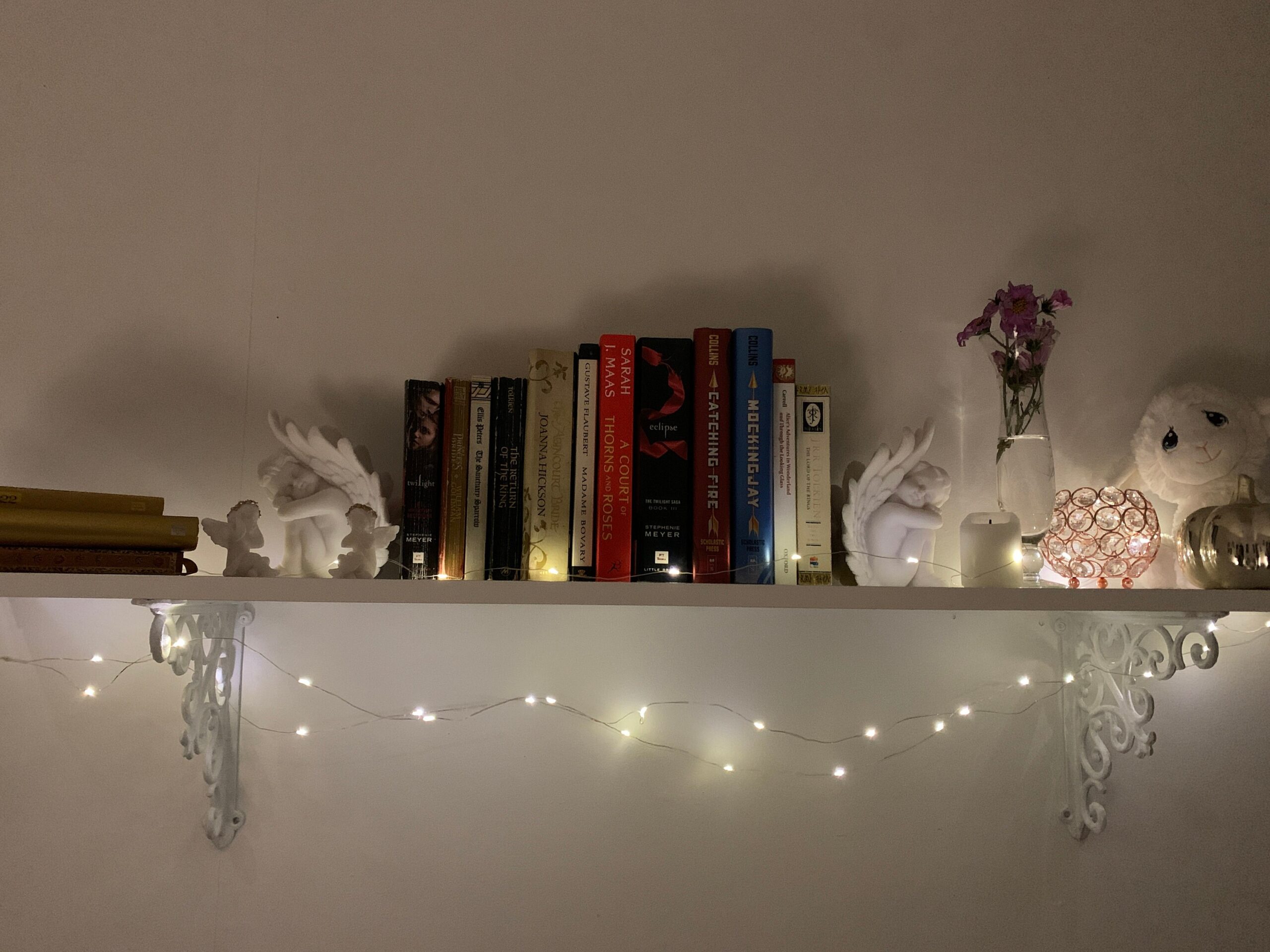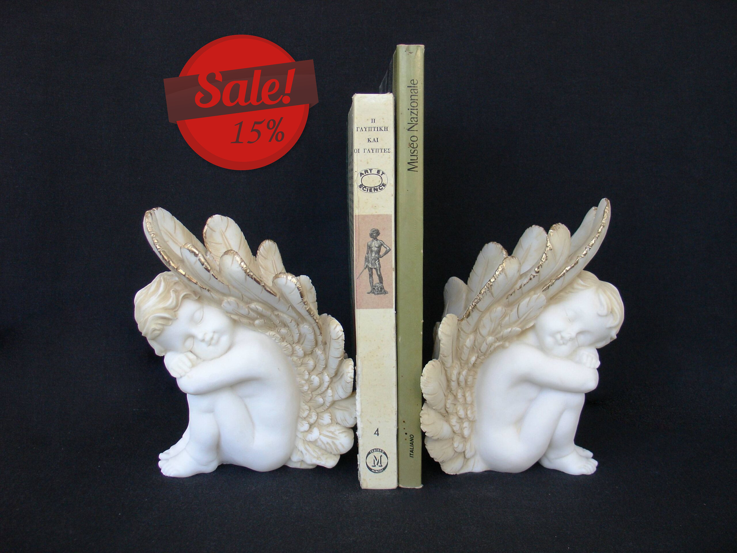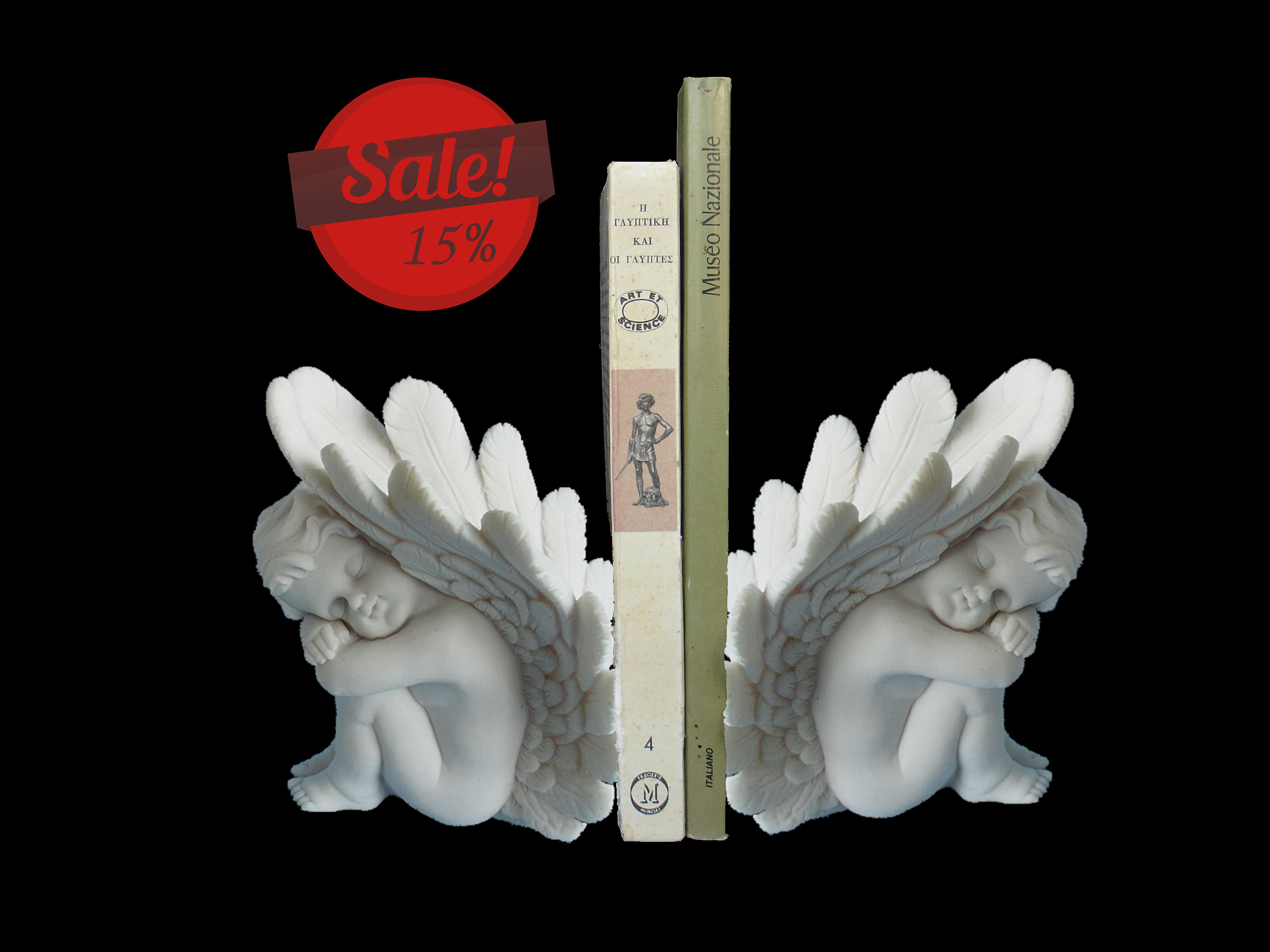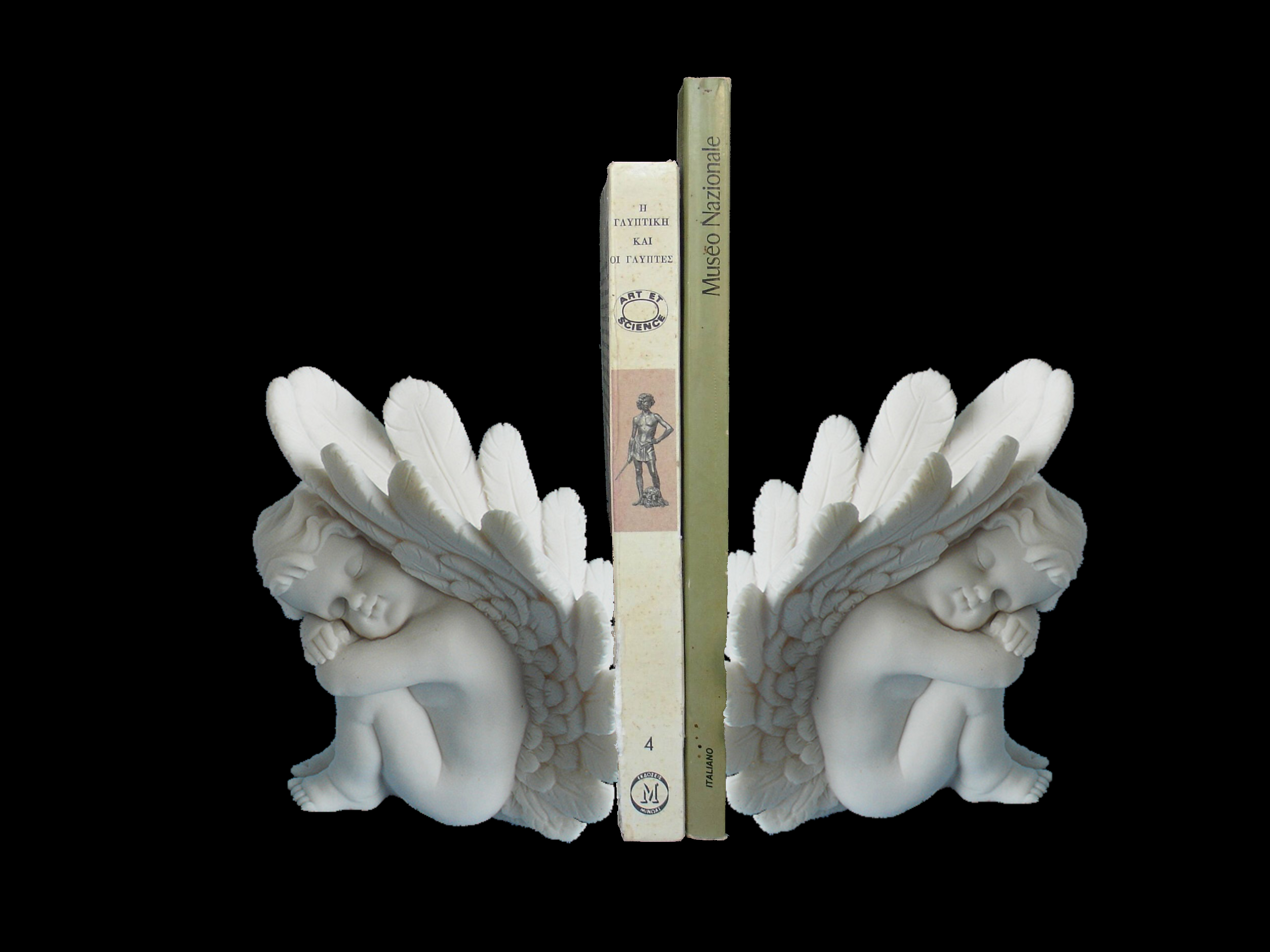 Greek statue of an Angel may used for bookend at left side. Combine this with the right side Angel for a symmetric view.