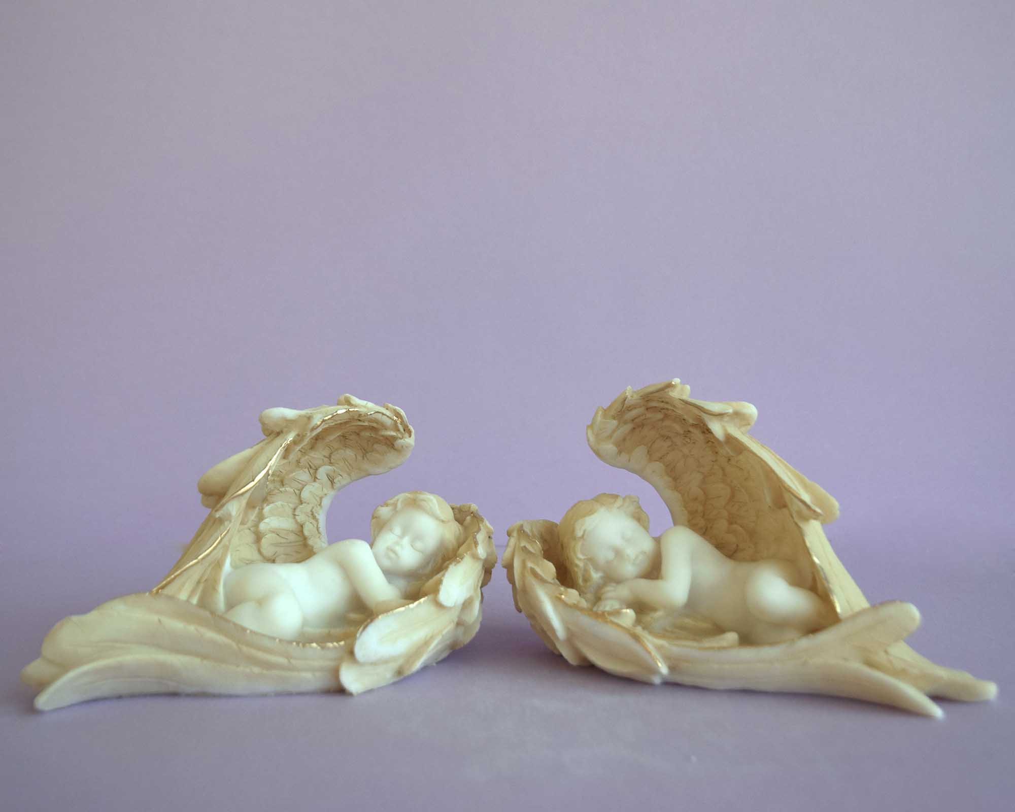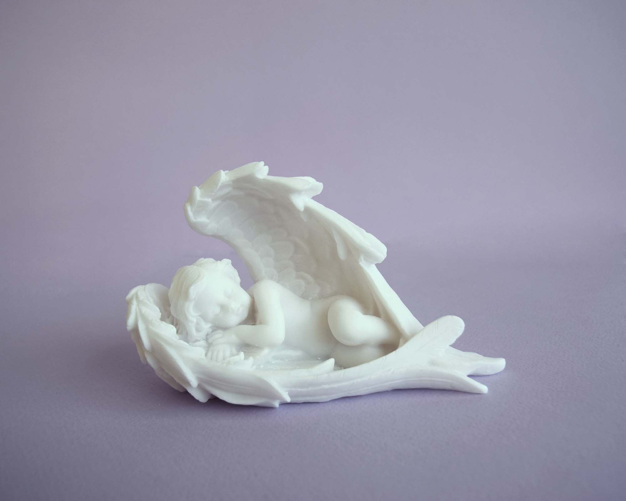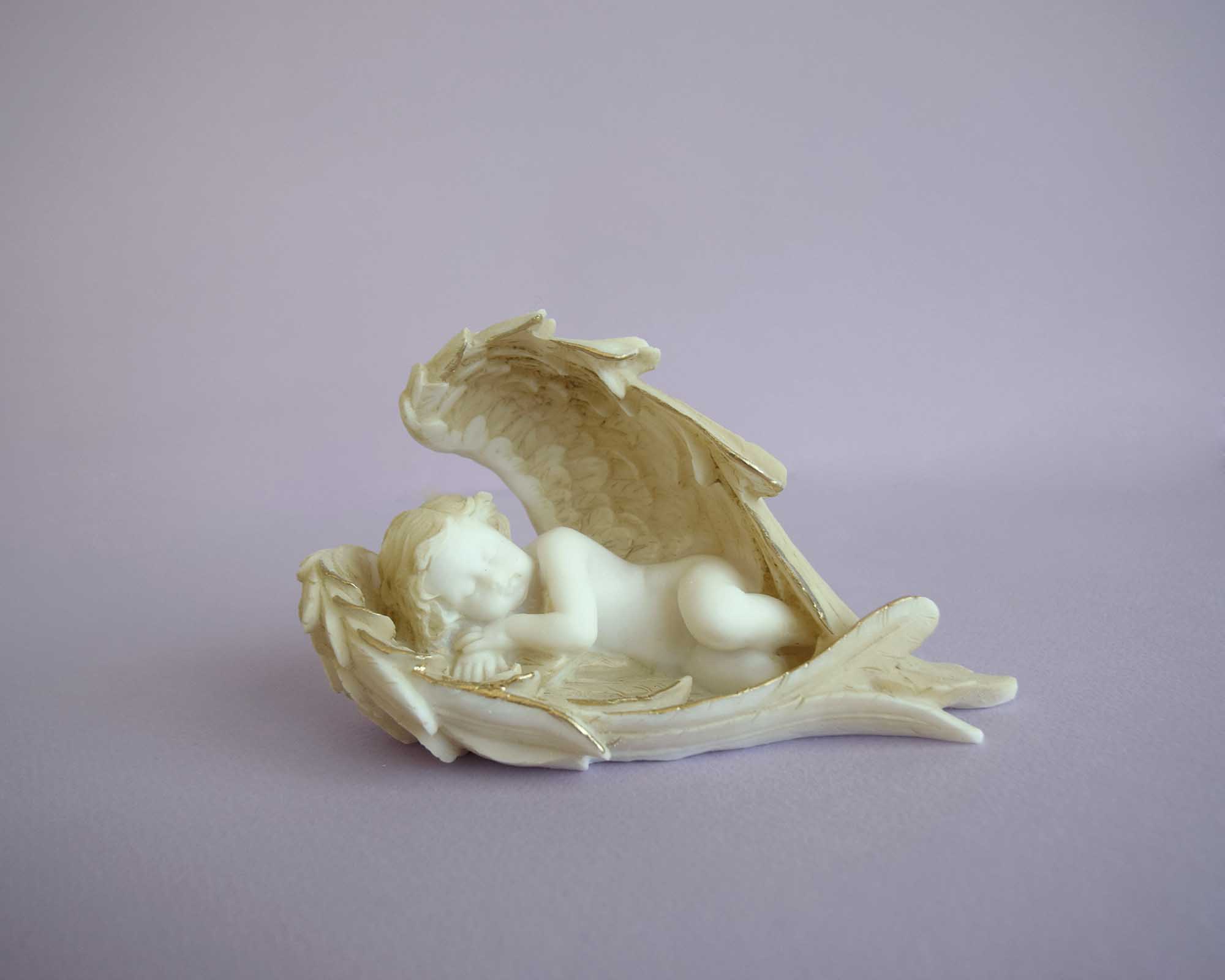 A statue of an Angel sleeping in its wings left view. There is also a right view so they both can be combined.