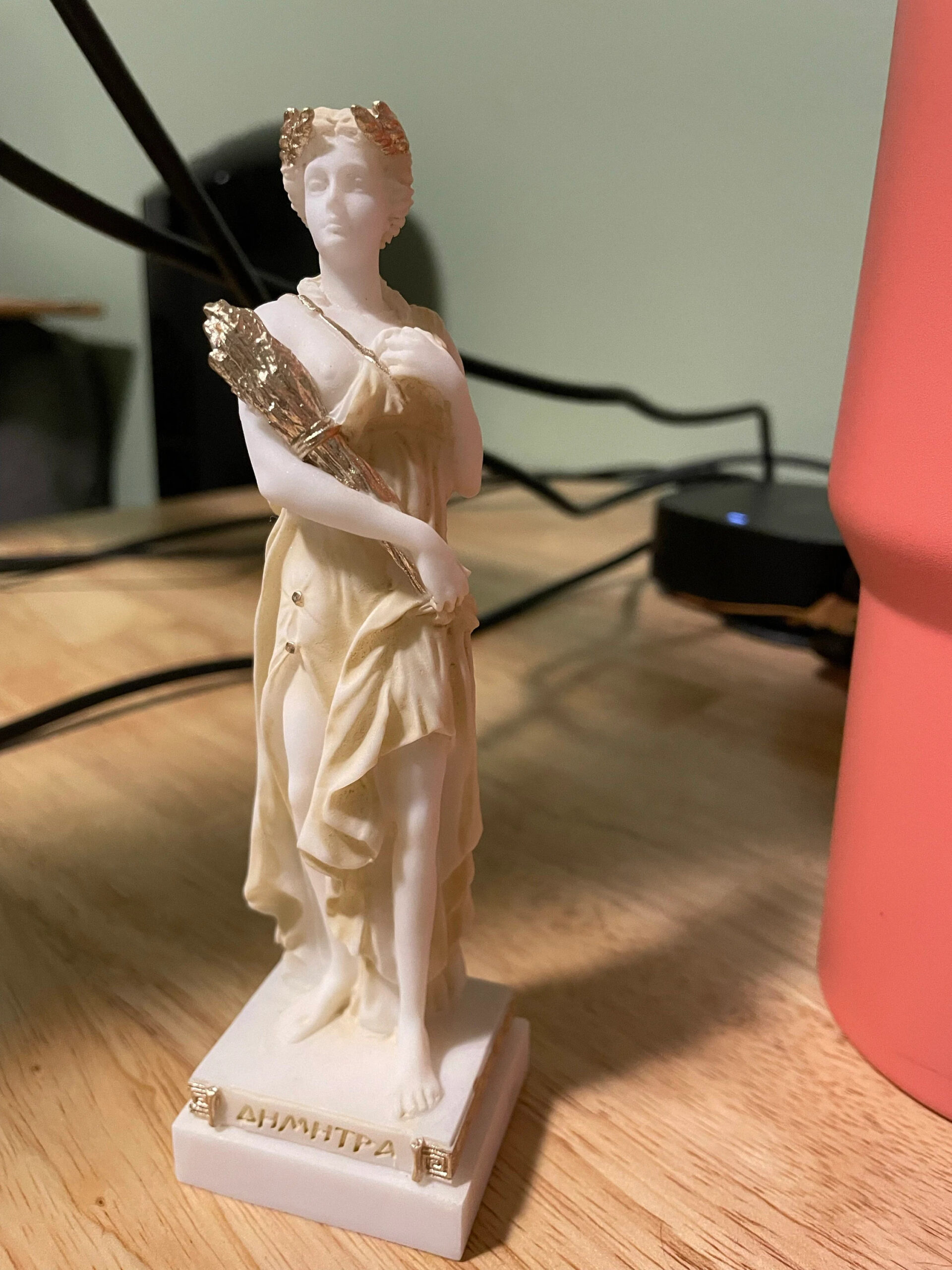 In ancient Greek religion and mythology, Demeter is the goddess of the harvest and agriculture, presiding over grains and the fertility of the earth. Her cult titles include Sito, “she of the Grain”, as the giver of food or grain, and Thesmophoros, “Law-Bringer”, as a mark of the civilized existence of agricultural society. Read more…