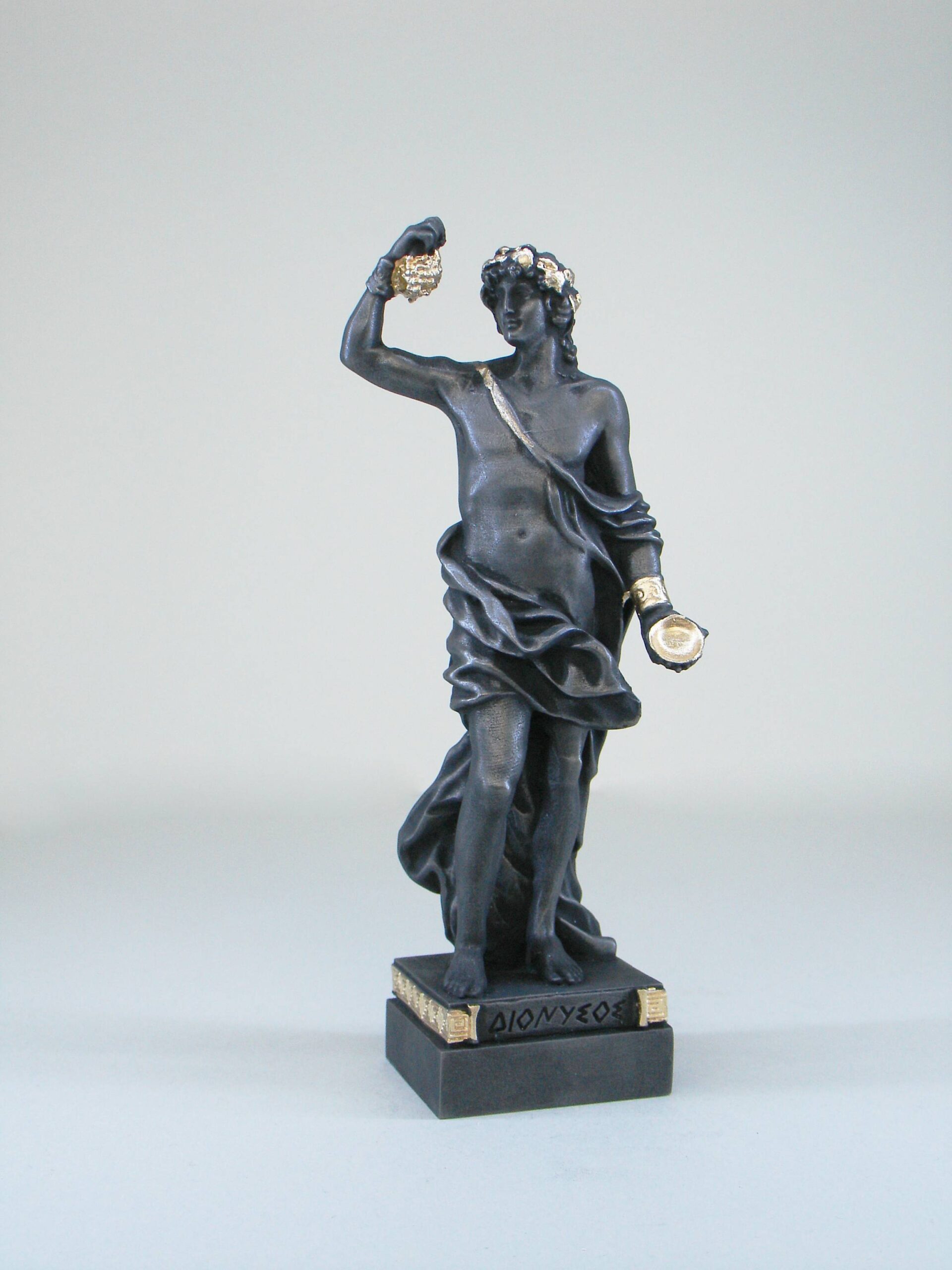 Greek statue of Dionysus holding a bunch of grapes and a container. Αn Olympian Greek statue for sale.