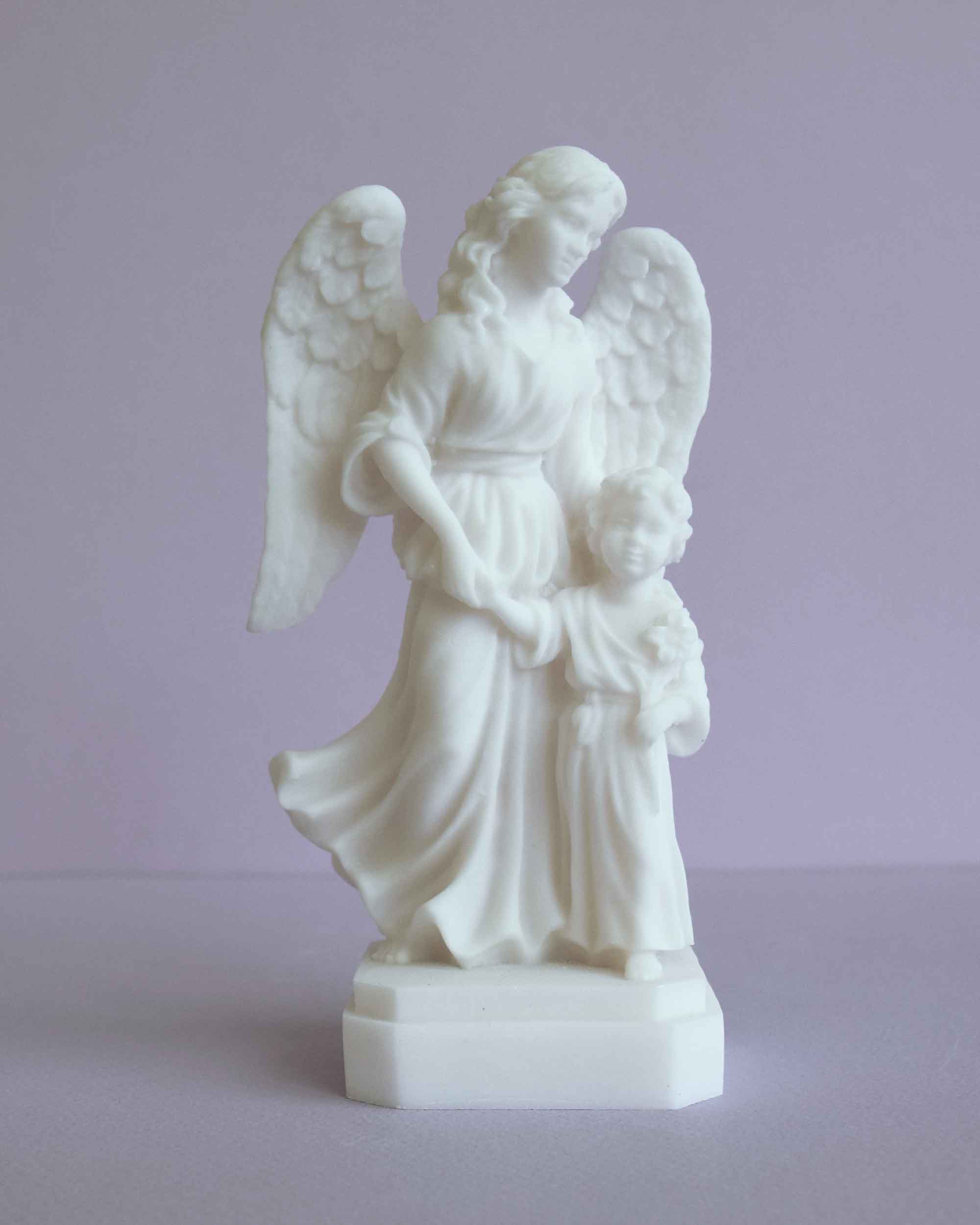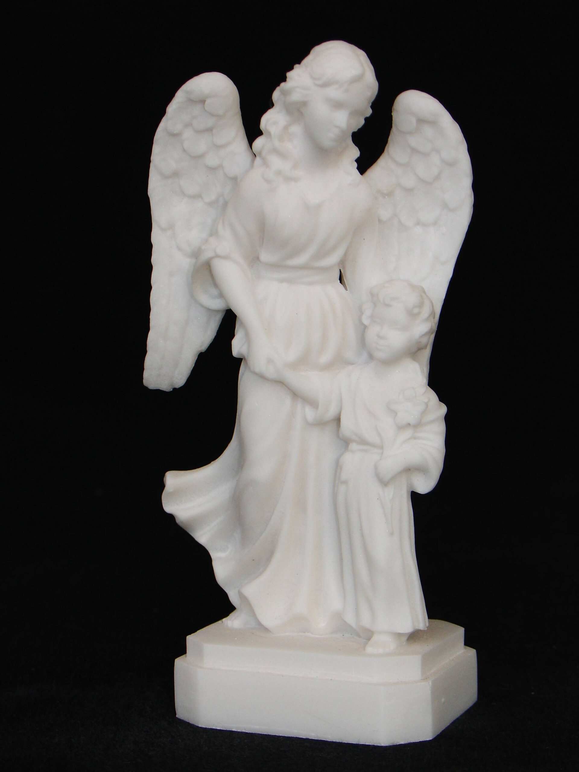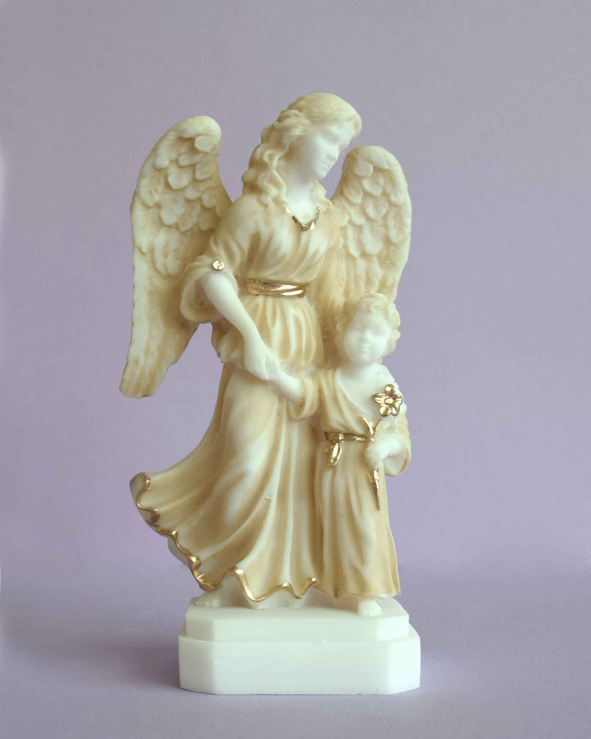 Greek statue of a Guardian angel with a little girl holding a flower.