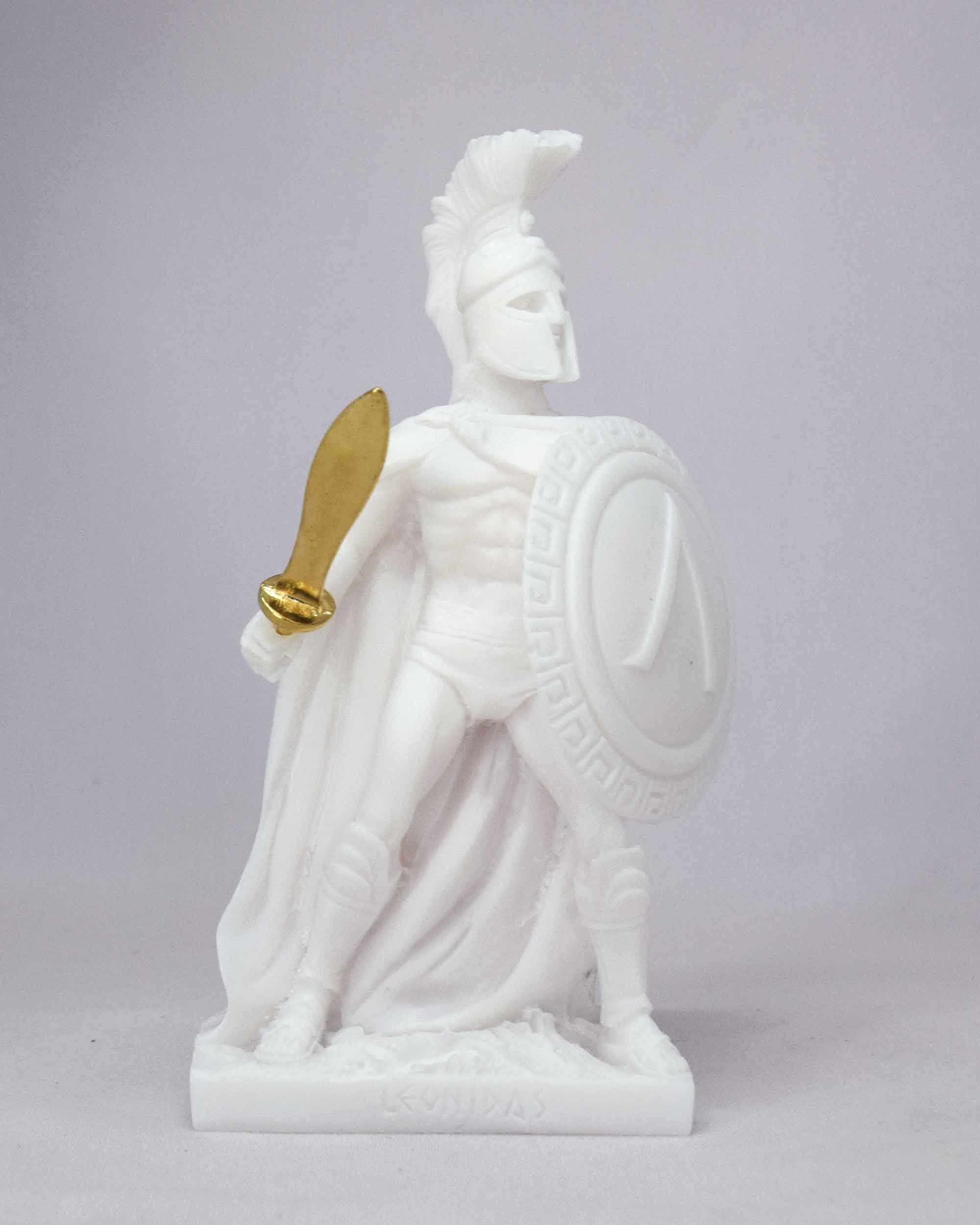 Greek statue of Leonidas in fighting position holding sword and shield. The Sword of Achilles is in gold color in all variations