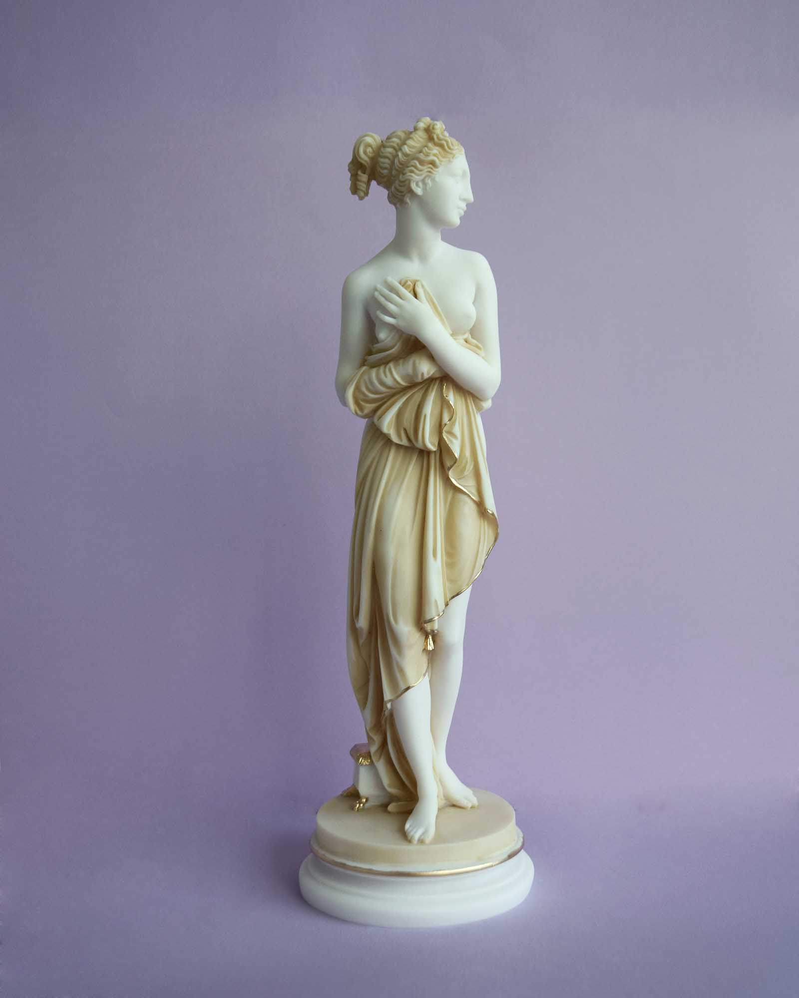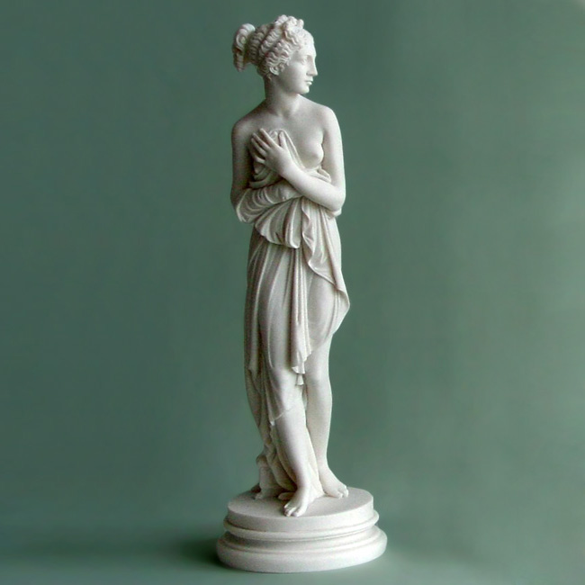 Greek statue of Pandora looking right.