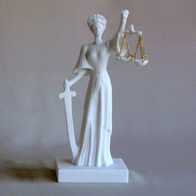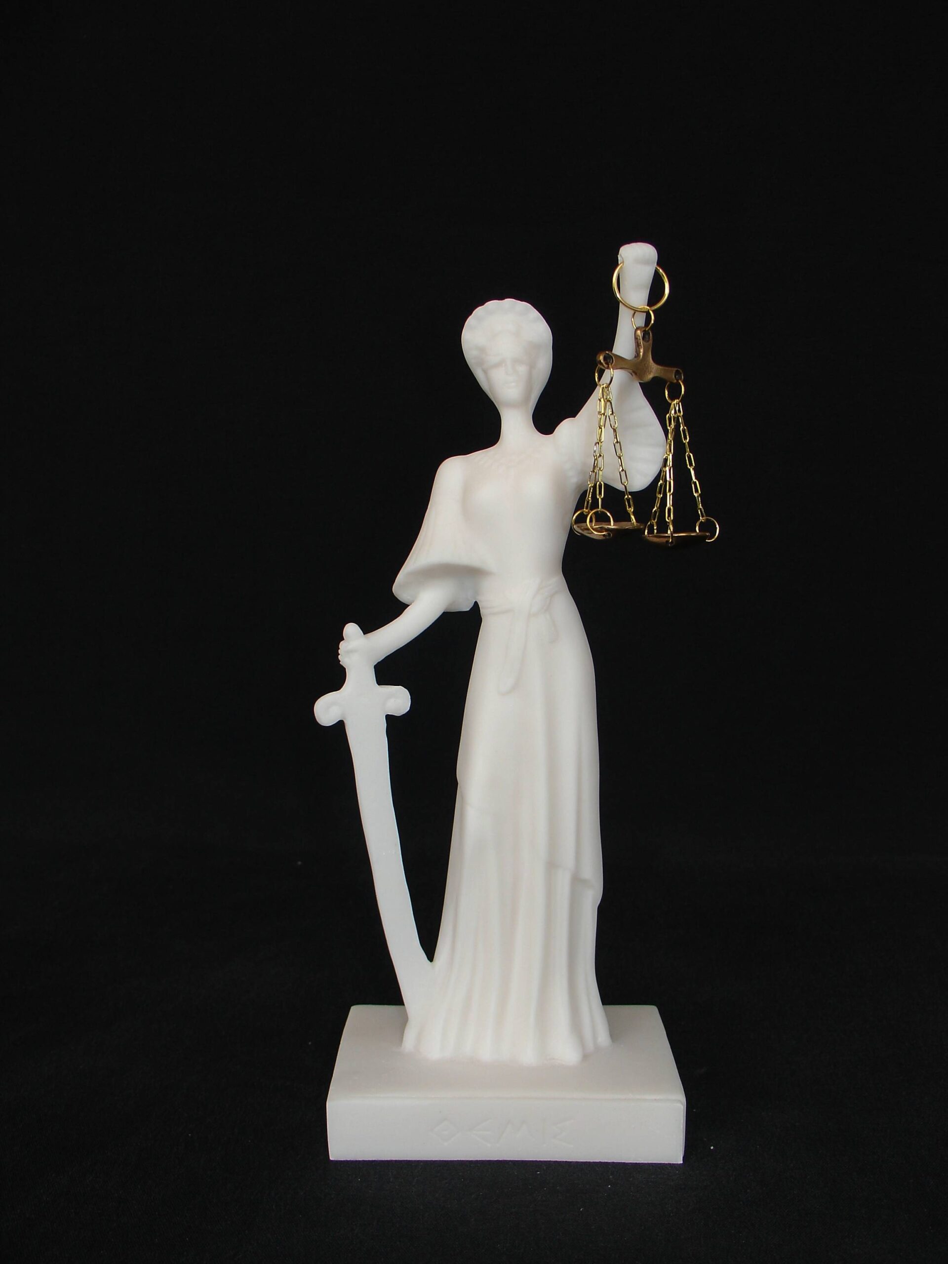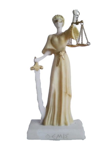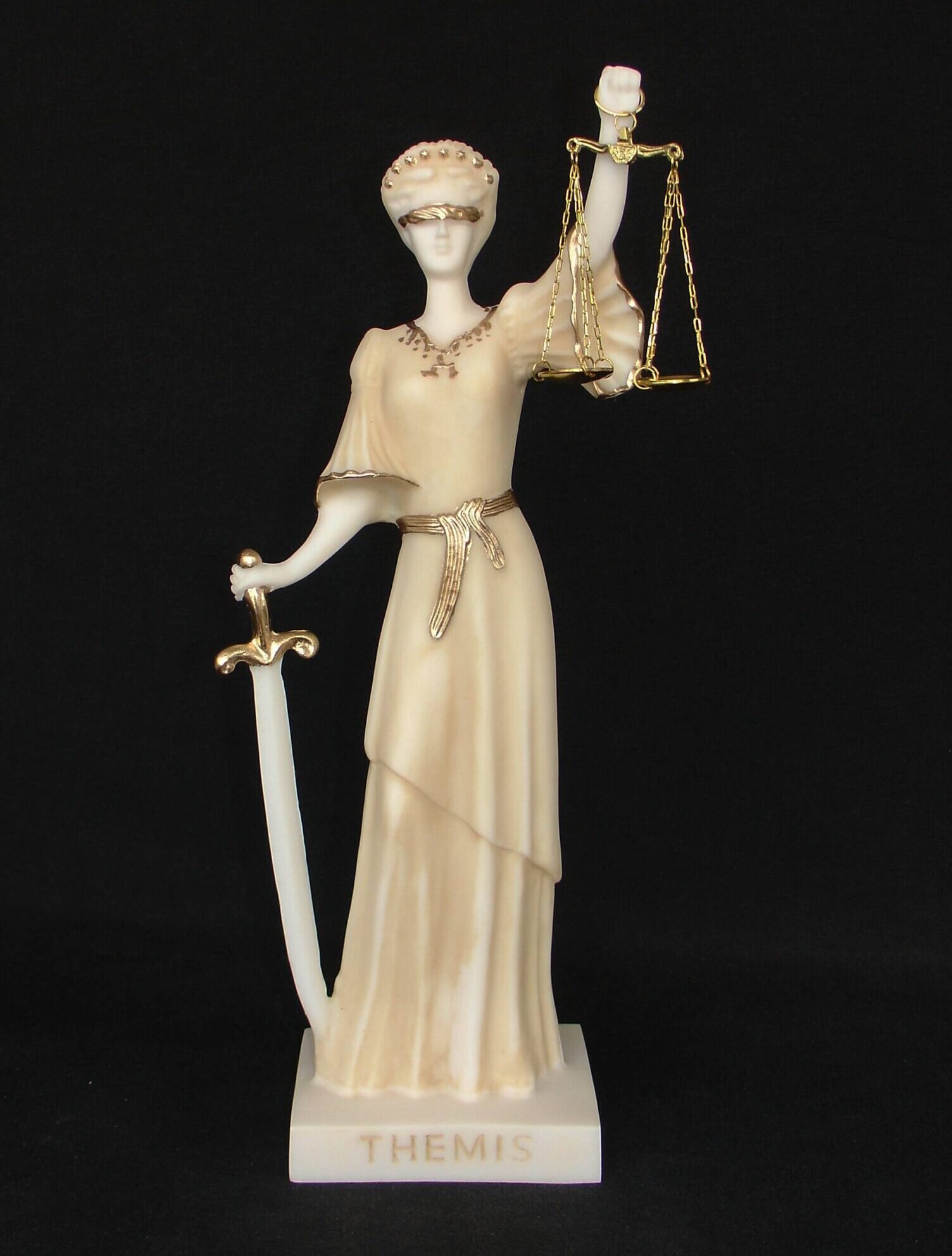 Greek statue of Themis Blind Goddess of Justice with her name written in Latin characters. Ideal gift for Lawyers and Law offices.
